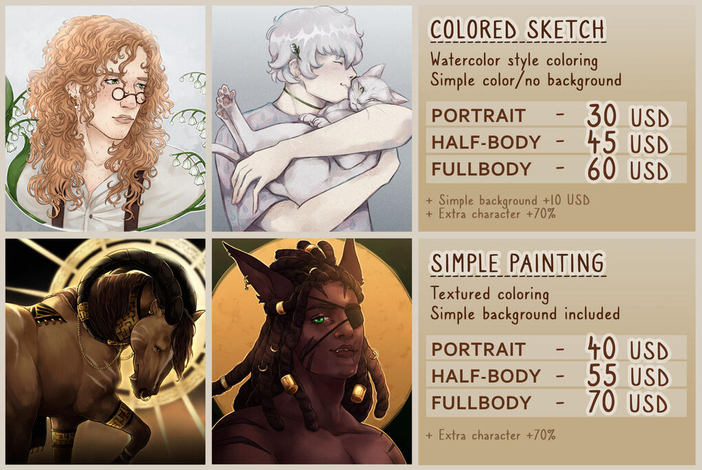 • Be mindful that I sometimes work pretty slow, since this is not my full-time job and I take off days. The usual time estimate for a colored & shaded piece is 2 weeks after payment, but that time can vary.• I retain all rights to commissioned art to be showcased on my socials & portfolio. If you don't want the work to be made public, we can discuss that before hand.